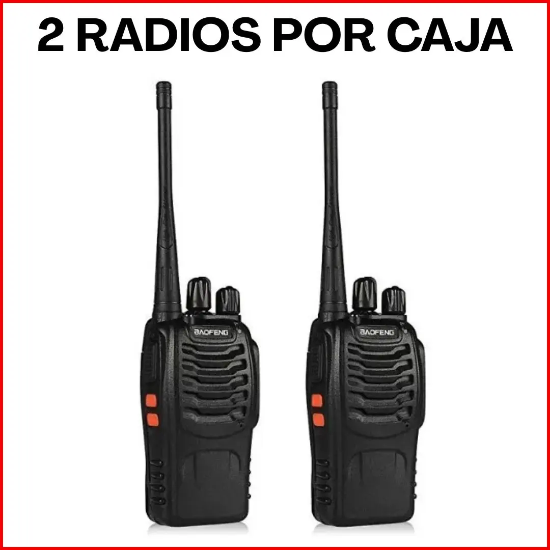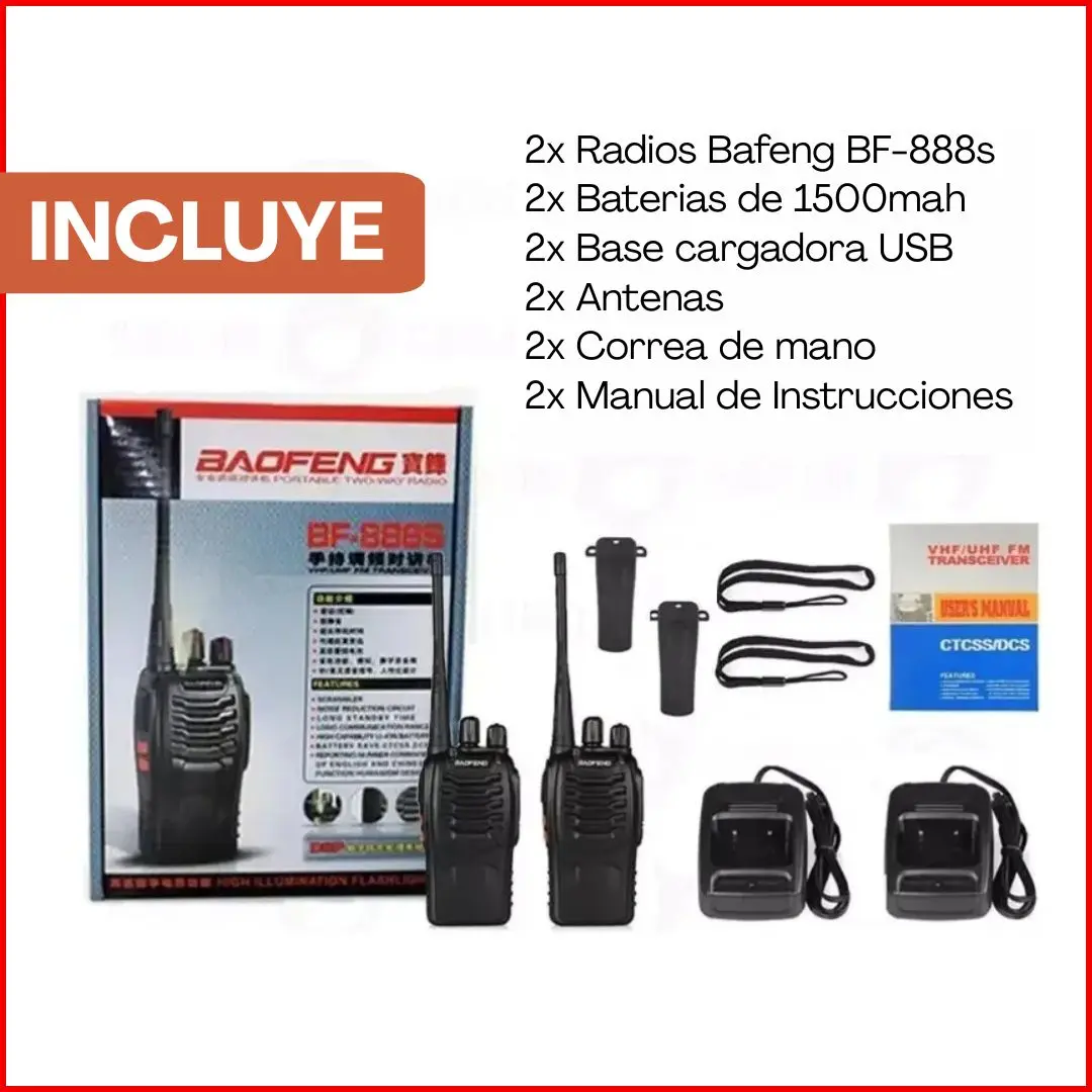 2 radios Baofeng BF-888S, baterías, cargadores, antenas, clips de cinturón y manual básico (según stock).